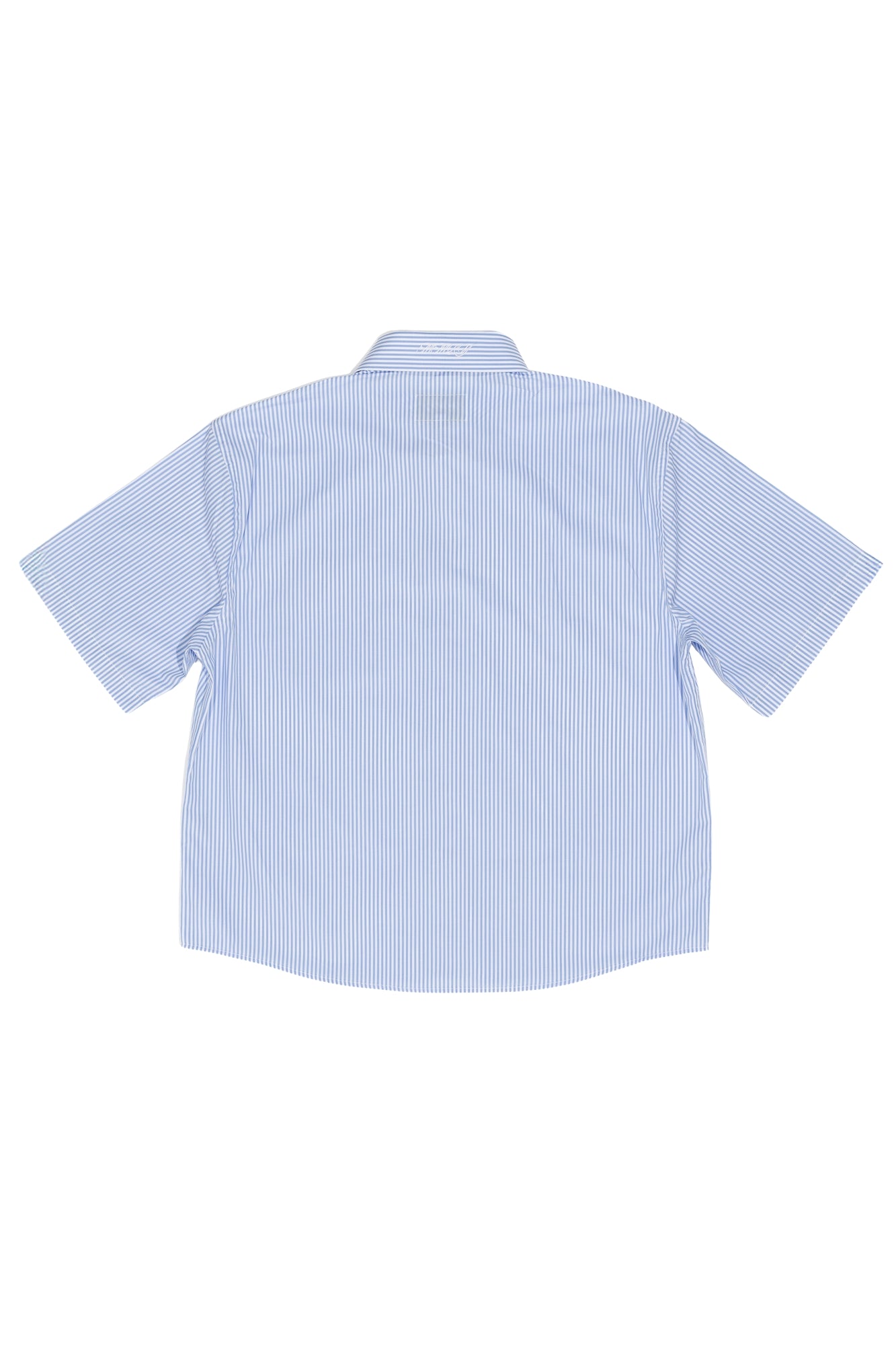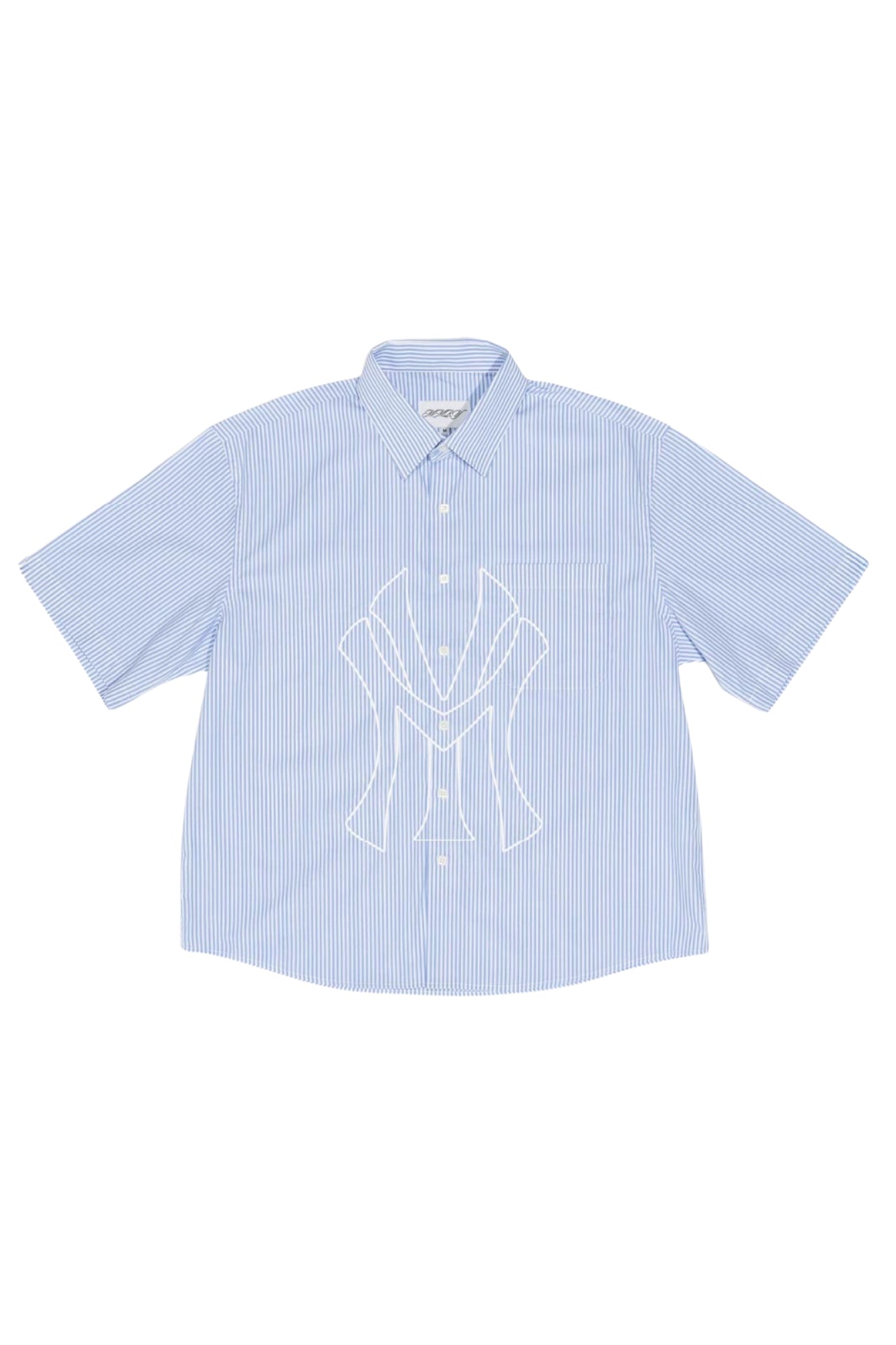Introducing the "MY" Pinstripe Shirt in Blue. This shirt is constructed from 100% Cotton, featuring a chest pocket, a double layered collar, square buttons, a printed front logo, and a back collar embroidery.